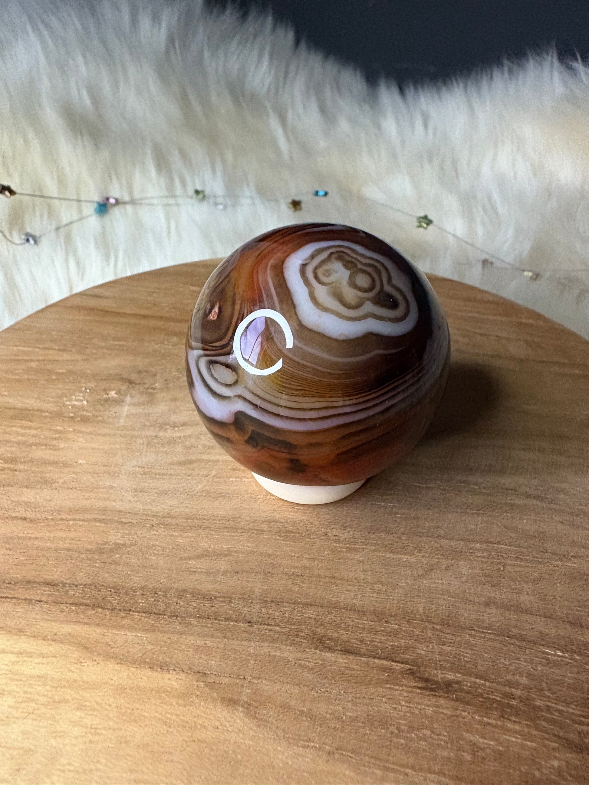 Die Sardonyx Kugel beeindruckt mit ihren warmen, gestreiften Farbtönen von Rot, Braun und Weiß und ihrer harmonischen, runden Form. Sie strahlt Kraft und Stabilität aus.